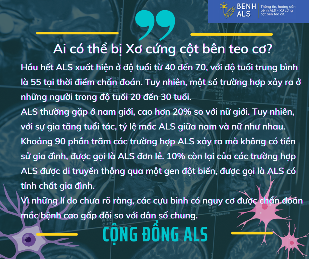 ALS thường gặp ở nam giới, cao hơn 20% so với nữ giới. Tuy nhiên, với sự gia tăng tuổi tác, tỷ lệ mắc ALS giữa nam và nữ như nhau.