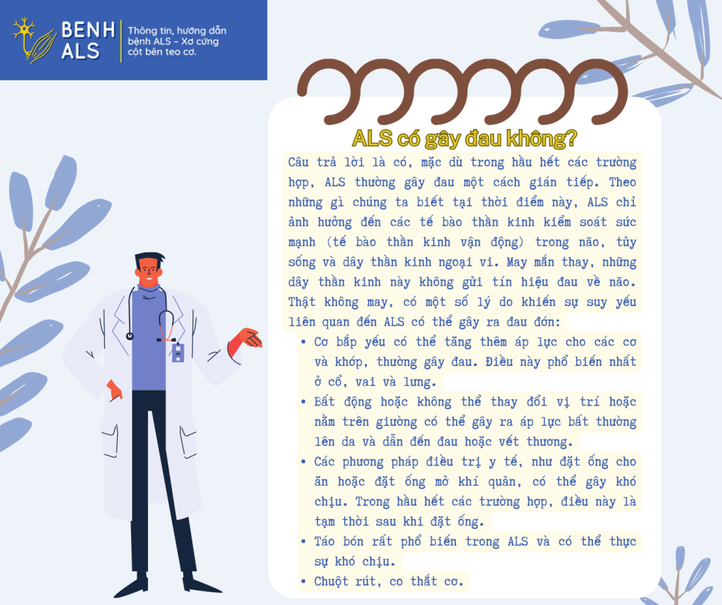 Câu trả lời là có, mặc dù trong hầu hết các trường hợp, ALS thường gây đau một cách gián tiếp. Theo những gì chúng ta biết tại thời điểm này, ALS chỉ ảnh hưởng đến các tế bào thần kinh kiểm soát sức mạnh (tế bào thần kinh vận động) trong não, tủy sống và dây thần kinh ngoại vi. May mắn thay, những dây thần kinh này không gửi tín hiệu đau về não. Thật không may, có một số lý do khiến sự suy yếu liên quan đến ALS có thể gây ra đau đớn: