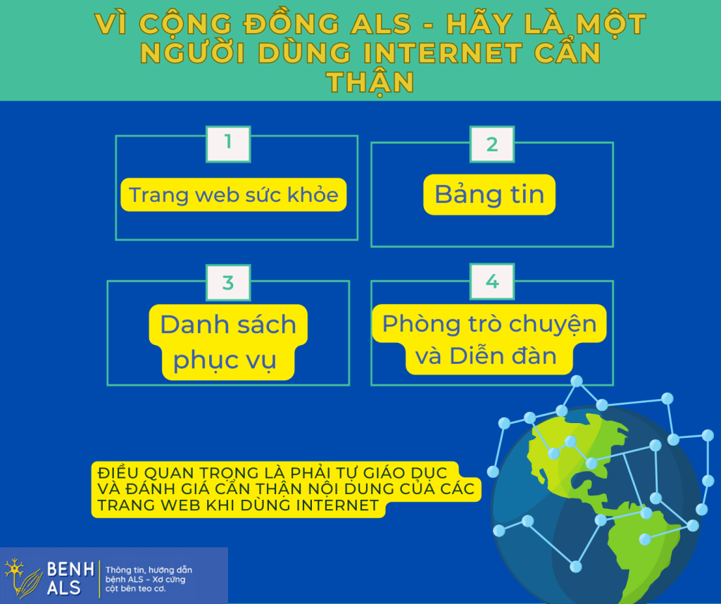 Internet đã trở thành một công cụ có giá trị để đưa và nhận thông tin. Miễn là bạn có thể cân bằng những gì bạn nghe được với sự tư vấn thường xuyên của bác sĩ hoặc chuyên gia y tế khác, bạn có thể nâng cao kiến thức của mình với cả hiệu quả và sự tự tin.Hiệp hội ALS cung cấp các liên kết này chỉ cho mục đích thông tin. Hiệp hội không xác nhận các trang web này, cũng như bất kỳ sản phẩm hoặc bác sĩ nào đại diện trên các trang web này.
