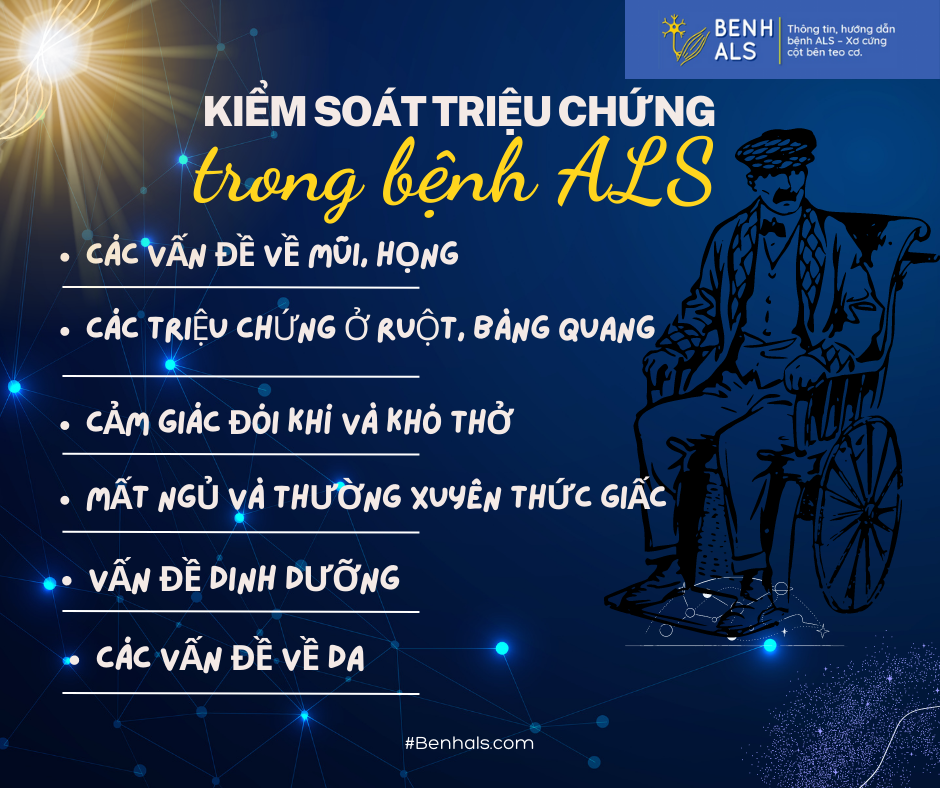 ALS là một rối loạn thần kinh dẫn đến tổn thương các tế bào thần kinh vận động và chủ yếu là chức năng cơ. Tuy nhiên, ALS cũng có tác động đến nhiều chức năng cơ thể khác nhau, cảm xúc, suy nghĩ và hành vi, và khả năng hoạt động trong cuộc sống hàng ngày. Ví dụ, không được tắm rửa và vận động dễ dàng có thể gây lở loét da, không nhai nuốt được có thể dẫn đến suy dinh dưỡng và mất nước. Tất cả những người mắc ALS sẽ không gặp phải mọi triệu chứng có thể xảy ra được thảo luận. Tin tốt là có nhiều cách để ngăn ngừa và điều trị các triệu chứng liên quan đến ALS. Bạn nên biết trước tất cả những cách ALS có thể ảnh hưởng đến bạn để bạn có thể nhận ra khi nào bạn cần thay đổi để ngăn ngừa hoặc điều trị các triệu chứng để tối đa hóa sự thoải mái của bạn.