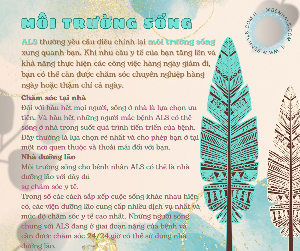 ALS thường yêu cầu điều chỉnh lại môi trường sống xung quanh bạn. Khi nhu cầu y tế của bạn tăng lên và khả năng thực hiện các công việc hàng ngày giảm đi, bạn có thể cần được chăm sóc chuyên nghiệp hàng ngày hoặc thậm chí cả ngày. Dịch vụ chăm sóc này có thể được cung cấp tại nhà riêng của bạn, nhưng cũng có thể yêu cầu chuyển đến một ngôi nhà hoặc cơ sở khác.