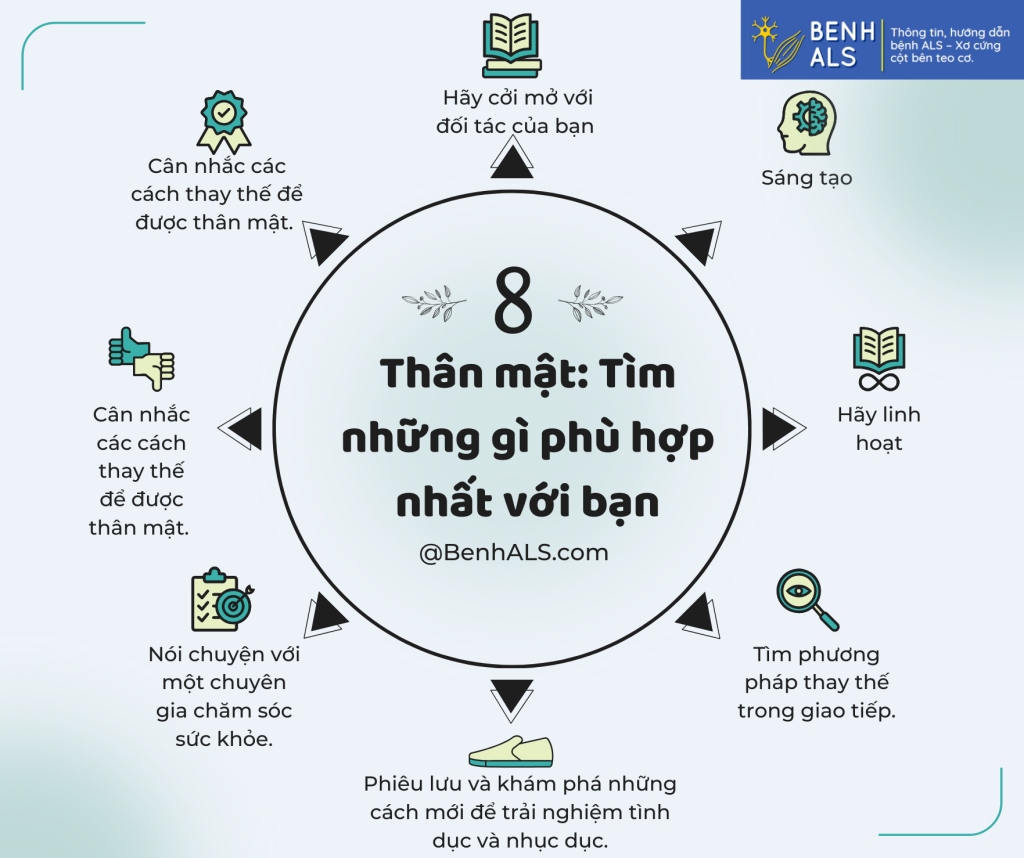 Thông tin chi tiết từ những người bệnh ALS  “ALS ảnh hưởng đến mỗi người một cách khác nhau. Không có bản đồ đường đi về những gì sẽ xảy ra tiếp theo. Bạn không biết mỗi ngày sẽ mang lại điều gì và sự không chắc chắn có thể khiến bạn phát điên. Mọi người mà chúng tôi gặp dường như biết ai vừa mới mắc ALS, hoặc biết ai đó đã mắc ALS, và họ sẽ chia sẻ những câu chuyện với chúng tôi. Tôi đã sớm quyết định tránh việc tự chẩn đoán trên internet và coi những câu chuyện về những người khác mắc ALS như muối bỏ bể.  Vì sự tỉnh táo của bản thân, tôi chú ý vào các tài liệu do Hiệp hội ALS cung cấp, và tôi đọc chúng theo trình tự. Tôi không vội vàng lướt qua nó vì tôi không muốn bắt đầu hình dung ra các triệu chứng. Tôi muốn được giáo dục nhưng không quá nhanh. Trong vòng vài tuần sau khi chẩn đoán, một người bạn đã gửi cho tôi cuốn sách, “Những ngày thứ Ba với Morrie,” của Mitch Albom. Nó ghi lại sự tiến triển của bệnh ALS ở cựu giáo sư đại học cho đến khi ông qua đời. Mặc dù nó là một cuốn sách xuất sắc và có ý định truyền cảm hứng, nhưng thực tế của căn bệnh này cuối cùng cũng bắt đầu hé lộ trong tôi.  Tôi và vợ tôi nói về căn bệnh và tương lai mọi lúc. Chúng tôi cố gắng lường trước từng trở ngại tiềm ẩn và lên kế hoạch để thích ứng. Nói tóm lại, chúng tôi lập kế hoạch cho điều tồi tệ nhất trong khi hy vọng điều tốt nhất. Có những ngày tốt và ngày ít tốt; Tôi không nghĩ những ngày tồi tệ đã bắt đầu. Mỗi ngày, tôi chọn cách tôi cảm thấy sống với ALS và tôi chọn tìm kiếm những mặt tích cực. Chúng ta hãy cẩn thận để có những người lạc quan xung quanh mình vì rất dễ đi đến mặt tối. Chúng tôi cần tạo ra khoảng cách giữa bạn bè và gia đình, những người chỉ có thể tập trung vào những tiêu cực hoặc cần sự an ủi liên tục từ chúng tôi. Thật đáng kinh ngạc khi thấy vòng kết nối của chúng tôi thay đổi như thế nào sau chẩn đoán: những người mà chúng tôi nghĩ sẽ ở đó vì chúng tôi trong một cuộc khủng hoảng đã rời xa chúng ta ; những người khác mà chúng ta có một mối quan hệ bình thường hơn cuối cùng đã trở thành không thể thiếu trong cuộc sống của chúng ta. Đó là điều đáng ngạc nhiên và đáng buồn cùng một lúc. ”  “Có quá nhiều điều phải suy nghĩ sau khi nhận chẩn đoán, nó thật dễ choáng ngợp, đơ cứng tại chỗ. Chúng tôi nhận ra rằng các ưu tiên của chúng tôi đã thay đổi chỉ sau một đêm và chúng tôi không phải là những người giống như chúng tôi trước khi được chẩn đoán. Chúng tôi biết mình cần phải lập kế hoạch để những tháng tiếp theo không bị lãng phí. Tôi và vợ đã ngồi xuống và phác thảo những việc cần làm trong ngắn hạn và trung hạn. Nó thực sự giúp chúng tôi cảm thấy như chúng tôi đã kiểm soát được mọi thứ.  Một trong những bước đầu tiên chúng tôi thực hiện là liên kết với cộng đồng ALS. Thông qua liên lạc, tôi đăng ký tham gia một cuộc thử nghiệm thuốc nghiên cứu lâm sàng và dành vài tháng đầu tiên để đi đến một cơ sở ở bang lân cận. Thử nghiệm mang lại nhiều thông tin, giúp chúng tôi nắm bắt được tiến độ học tập ALS nhanh chóng hơn. Như một lợi ích phụ, chúng tôi coi các chuyến đi như những kỳ nghỉ nhỏ và tận dụng tối đa thời gian của chúng tôi ở đó.