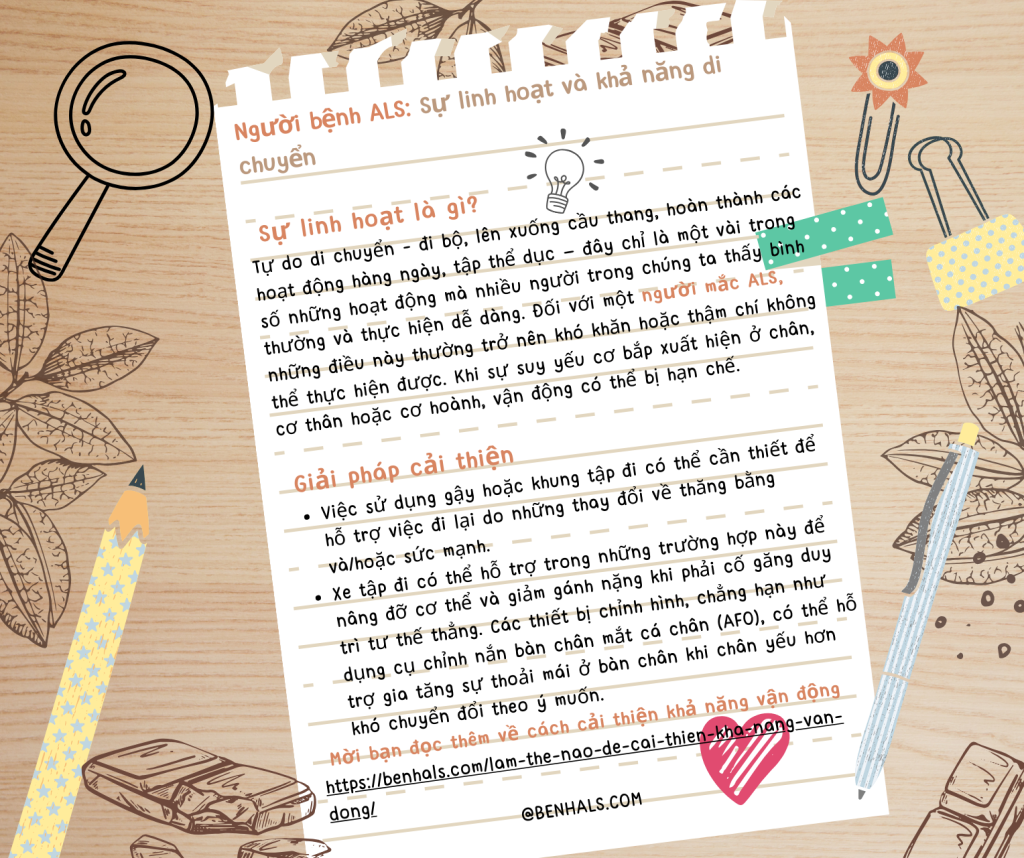 Đối với một người mắc ALS, những điều này thường trở nên khó khăn hoặc thậm chí không thể thực hiện được. Khi sự suy yếu cơ bắp xuất hiện ở chân, cơ thân hoặc cơ hoành, vận động có thể bị hạn chế. Làm việc với một nhà vật lý trị liệu để tìm hiểu những hoạt động được cho phép và các bài tập căng giãn cơ là điều cần thiết để duy trì chiều dài cơ, khả năng vận động của khớp và giảm tình trạng co cứng.