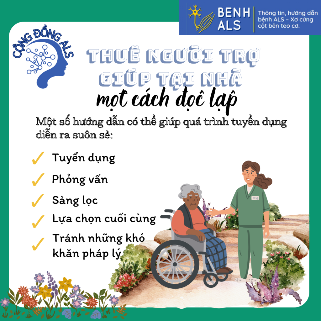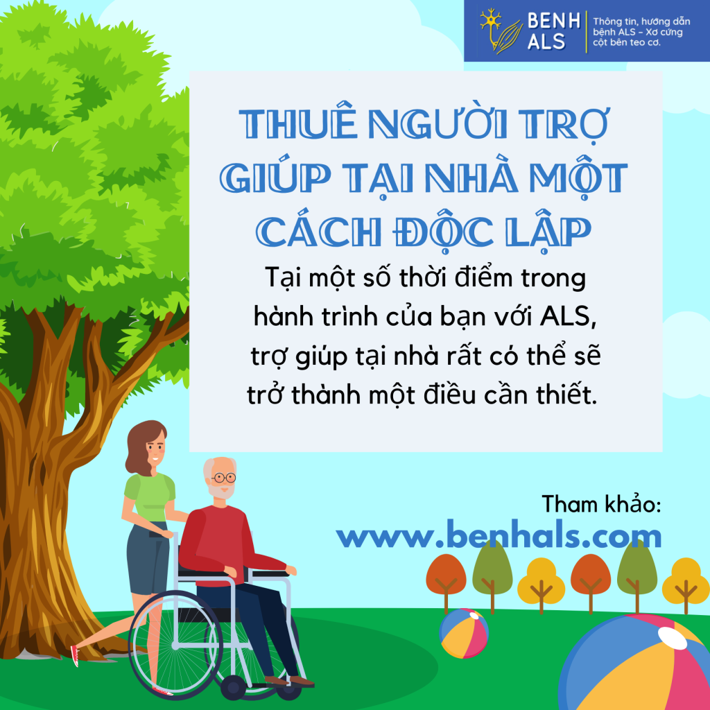 Tại một số thời điểm trong hành trình của bạn với ALS, trợ giúp tại nhà rất có thể sẽ trở thành một điều cần thiết. Nhiều gia đình chọn sử dụng một cơ quan y tế tại nhà hoặc một cơ quan chăm sóc sức khỏe tại nhà không phải là cơ quan y tế (đồng hành) để họ sắp xếp với những nhân viên phù hợp và điều phối việc cung cấp dịch vụ. Các gia đình khác chọn thuê sự giúp đỡ một cách độc lập, sử dụng sự giới thiệu cá nhân hoặc cơ quan đăng ký việc làm (đăng ký). Sự khác biệt giữa cơ quan việc làm và các loại cơ quan khác là cơ quan việc làm chỉ gợi ý khách hàng với các nhà cung cấp đủ điều kiện – nó không xử lý bất kỳ trách nhiệm nào của người sử dụng lao động, chẳng hạn như điều phối và giám sát việc cung cấp dịch vụ, quản lý bảng lương và thuế , hoặc cung cấp đào tạo liên tục cho nhân viên.
