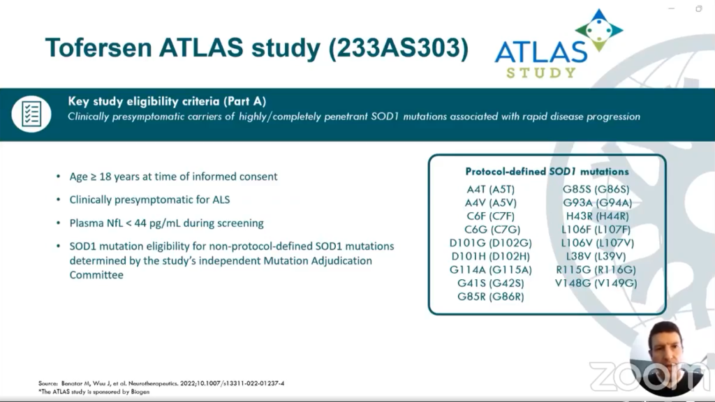 Thử nghiệm lâm sàng ATLAS là một thử nghiệm ngẫu nhiên mù đôi giai đoạn 3 với mục tiêu đánh giá hiệu quả nếu khởi động điều trị tofersen từ khi trước khi xuất hiện các triệu chứng ALS có thể làm chậm quá trình xuất hiện rõ ràng của các triệu chứng ALS và/hoặc làm chậm suy giảm chức năng sau khi đã xuất hiện rõ ràng. Phần A của nghiên cứu áp dụng một số tiêu chí tham gia, bao gồm người mang đột biến SOD1 với độ thấm (penetration) cao và liên quan đến sự tiến triển nhanh chóng của bệnh. Điều kiện tham gia nghiên cứu yêu cầu độ tuổi từ 18 trở lên tại thời điểm đồng ý tham gia, biểu hiện lâm sàng trước khi xuất hiện triệu chứng ALS, và lượng Plasma Nfl < 44 pg/mL. Đối với những đột biến SOD1 không được định rõ bởi các định nghĩa trong phần tiêu chuẩn lựa chọn bệnh nhân nghiên cứu, quyết định cuối cùng sẽ được đưa ra bởi ủy ban khoa học dựa trên bằng chứng khoa học hiện tại.