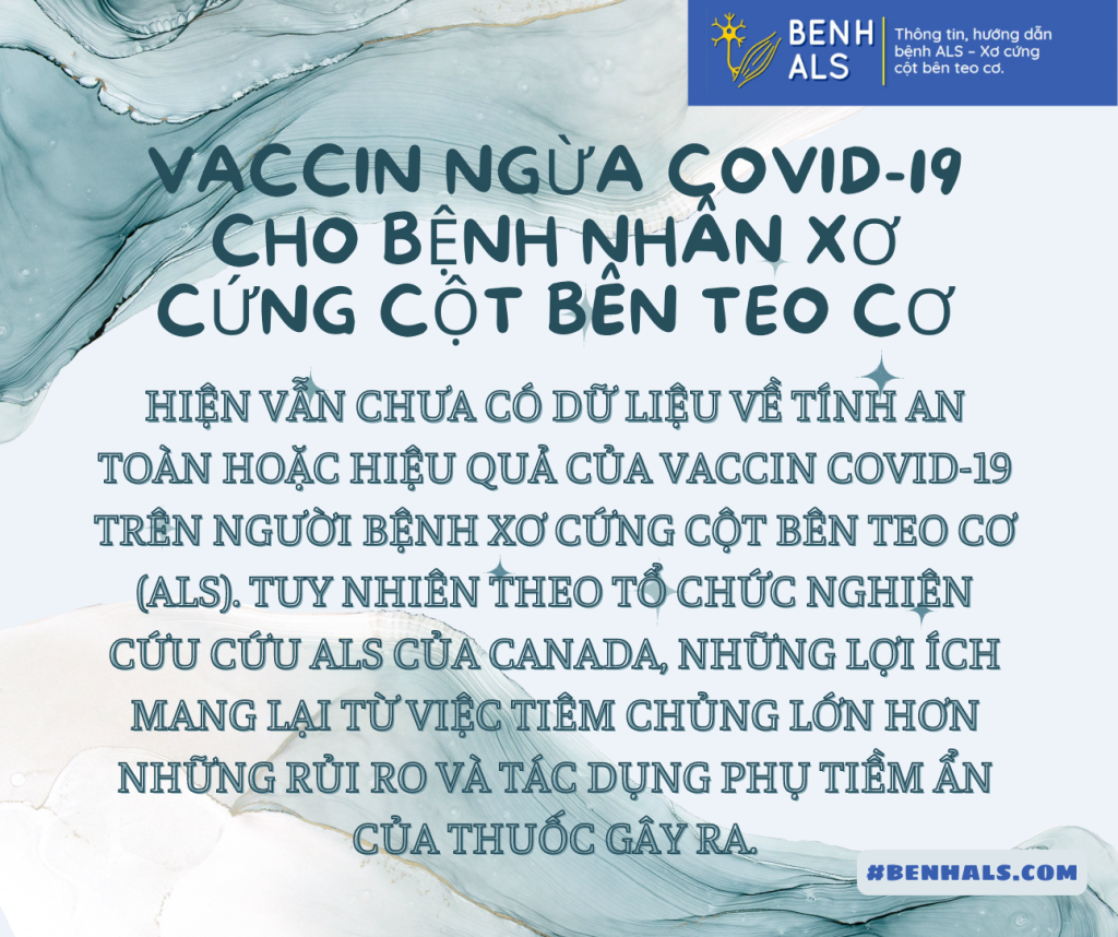 Hiện vẫn chưa có dữ liệu về tính an toàn hoặc hiệu quả của vaccin COVID-19 trên người bệnh xơ cứng cột bên teo cơ (ALS). Tuy nhiên theo tổ chức nghiên cứu cứu ALS của Canada, những lợi ích mang lại từ việc tiêm chủng lớn hơn những rủi ro và tác dụng phụ tiềm ẩn của thuốc gây ra.